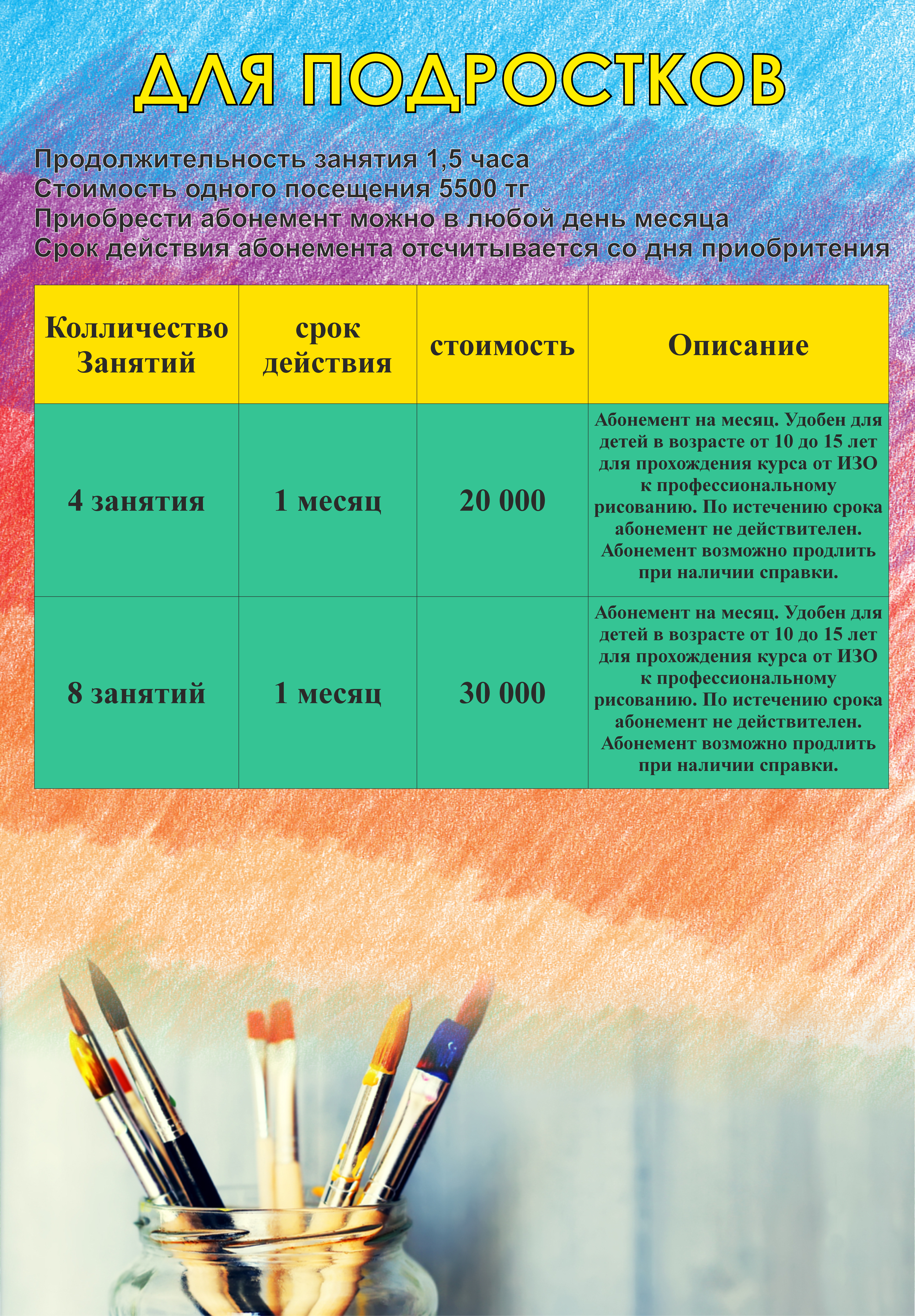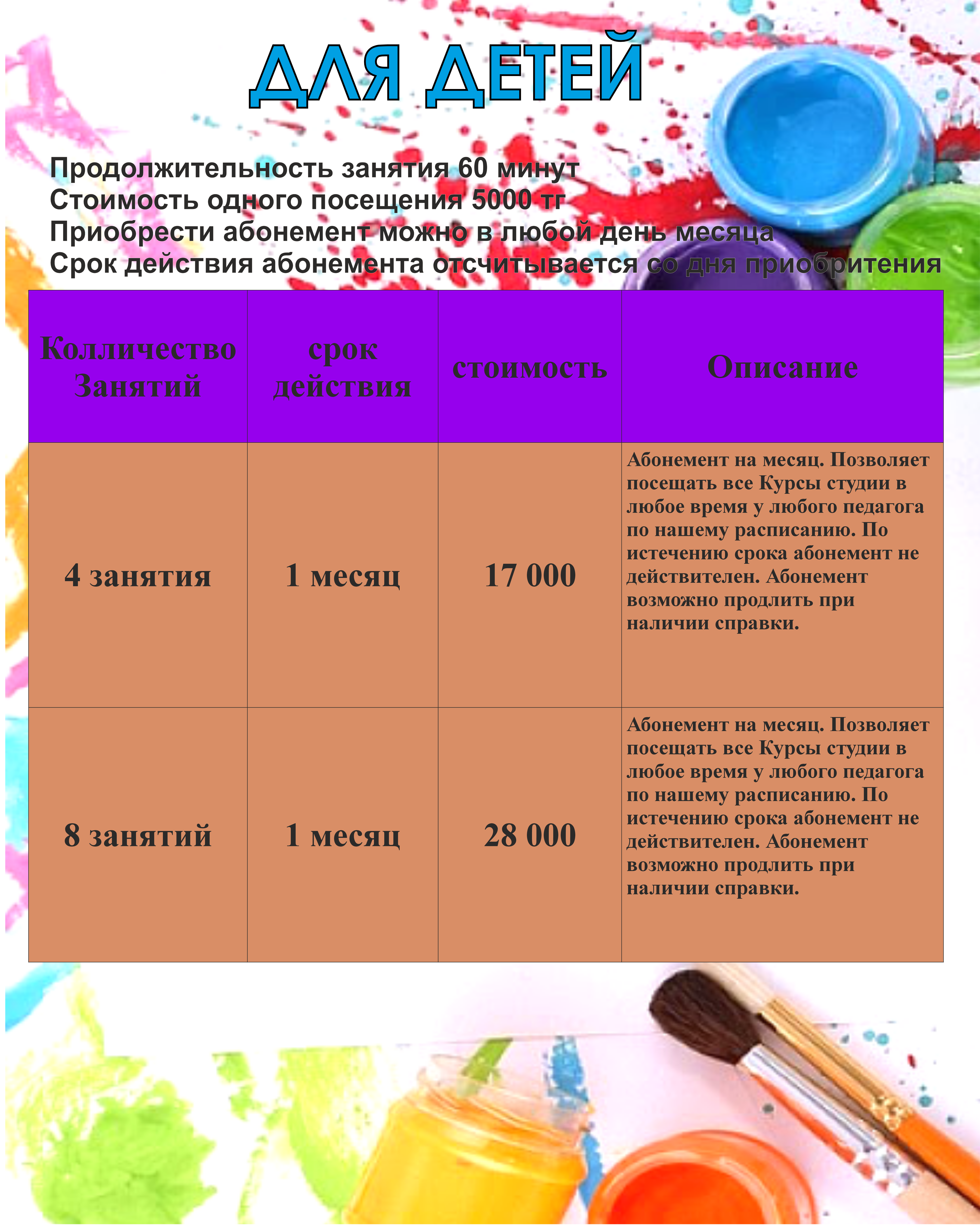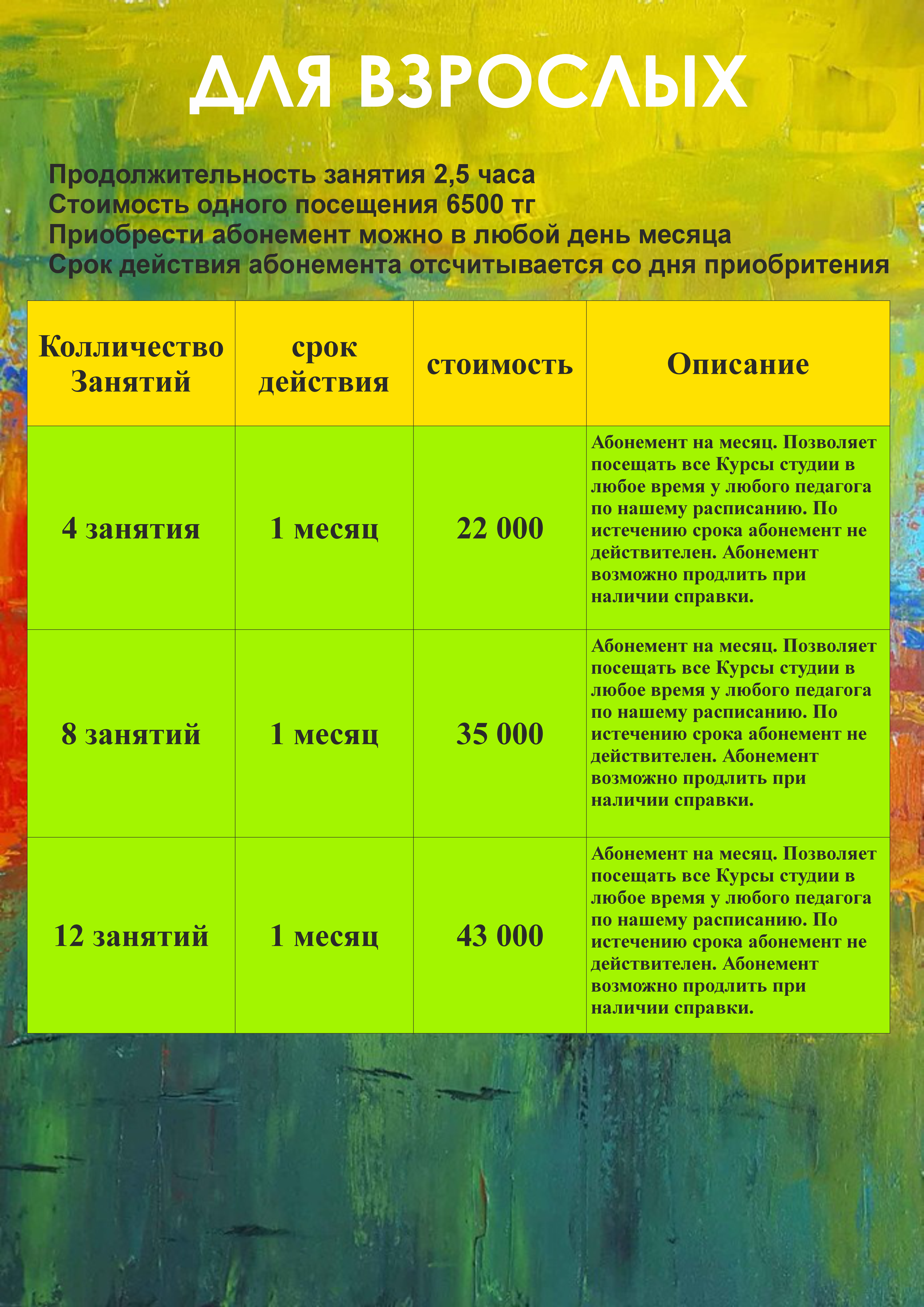 Вы приходите в удобное для вас время, по расписанию студии. Стоимость занятия - 15000тг (масло+холст), 10000тг (акрил+холст) - все материалы включены. Продолжительность 2,5-3 часа. Запись на занятие - обязательна!
